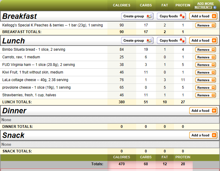 Take a look at my lunch for the day. I had a kiwi, a cup of strawberries, a medium carrot, cottage cheese, and a ham and provolone sandwich. They sell a type of bread here that is only 42 calories a slice! Love that! I'm sure in the States you have all sorts of lovely reduced calorie breads to choose from.